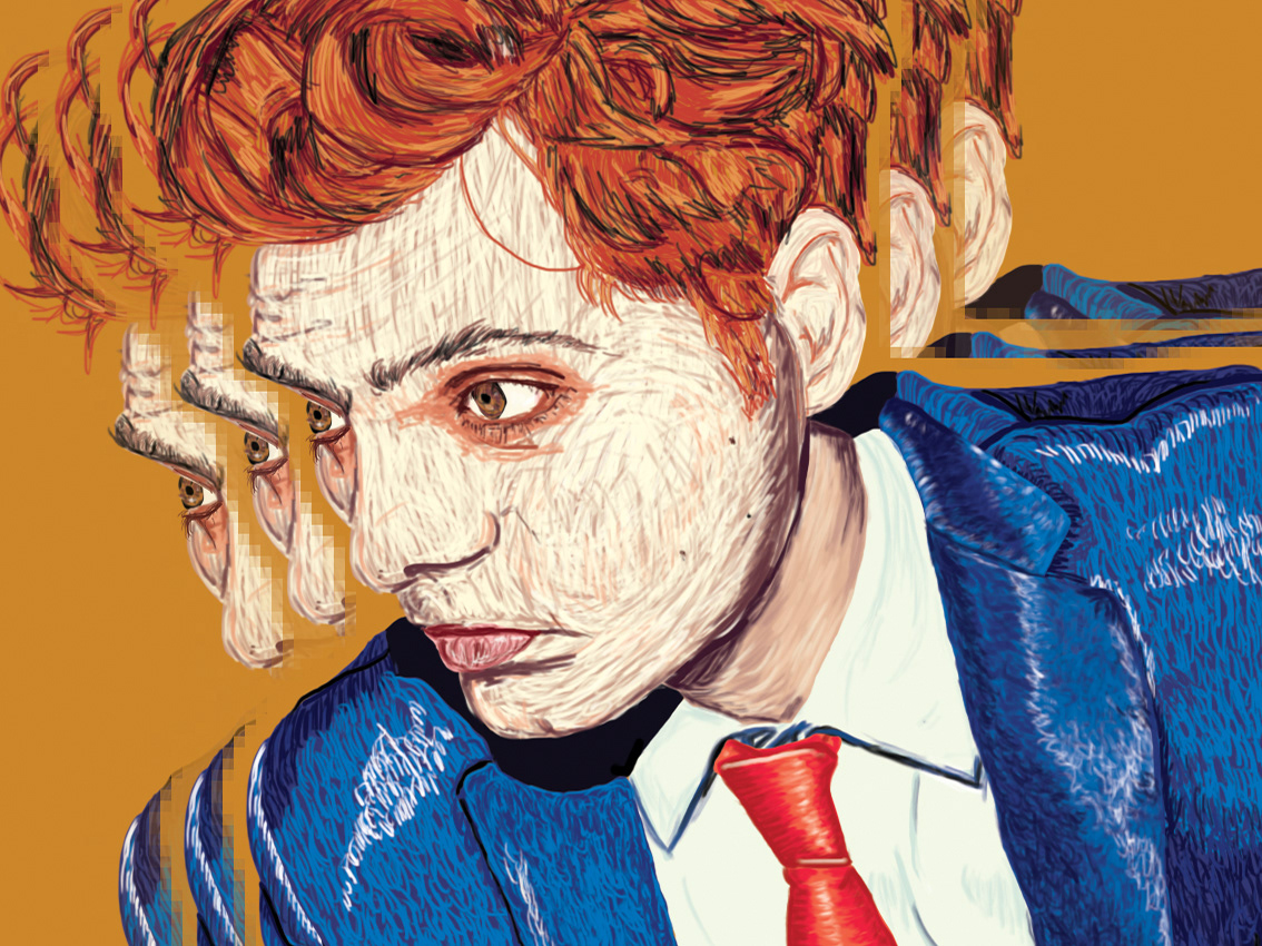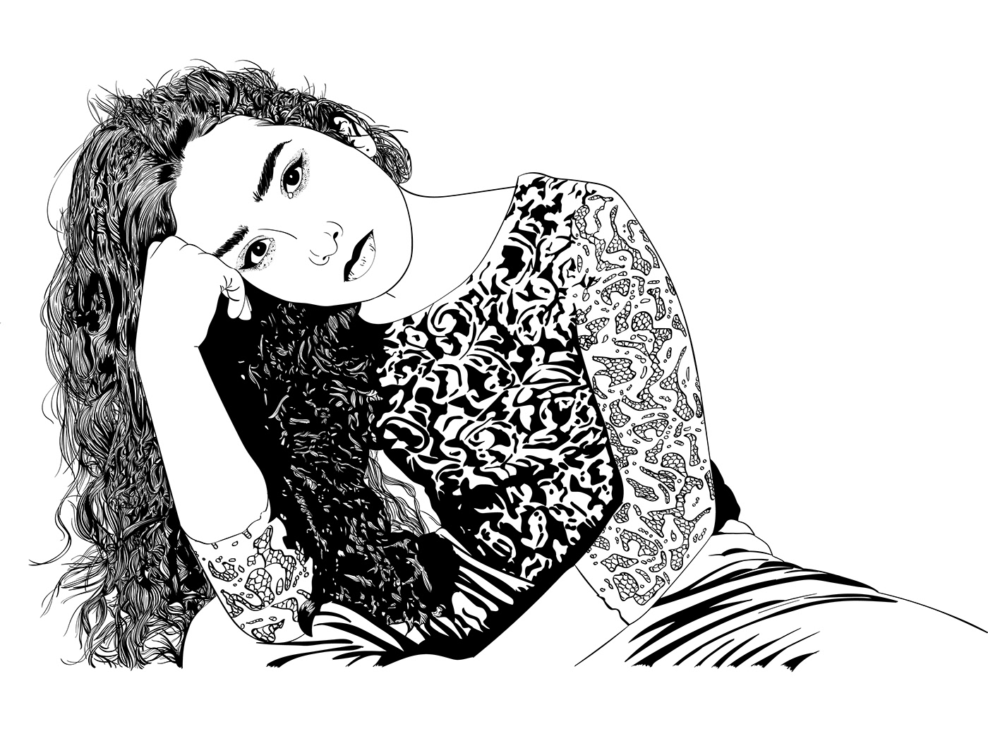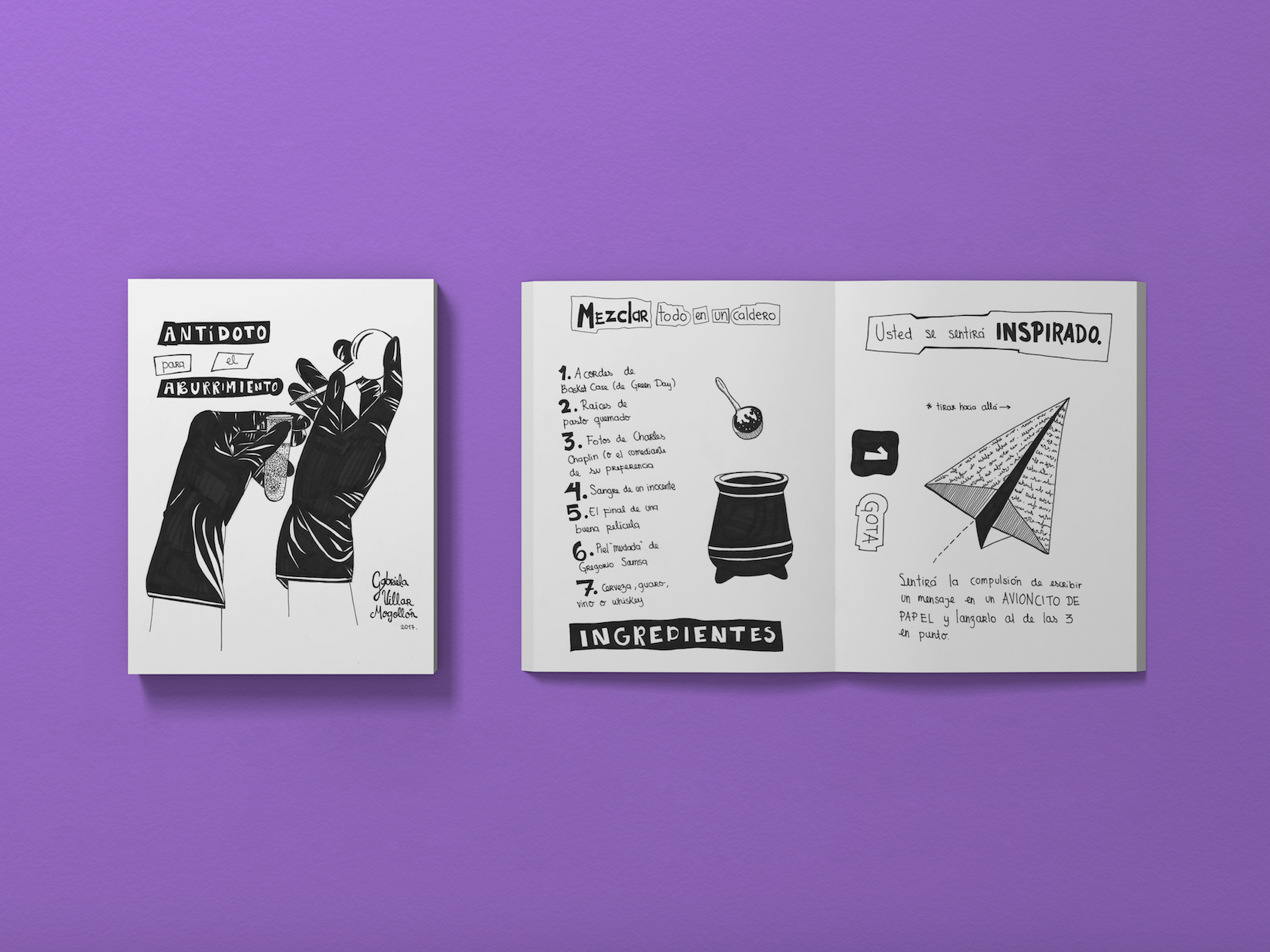 The design combines quick black and white illustrations with text made up with stamped letters. The narrative has a “thread of thought” style, meaning that it jumps between subjects rather quickly, it has gaps or “voids”, and it is open to interpretation.